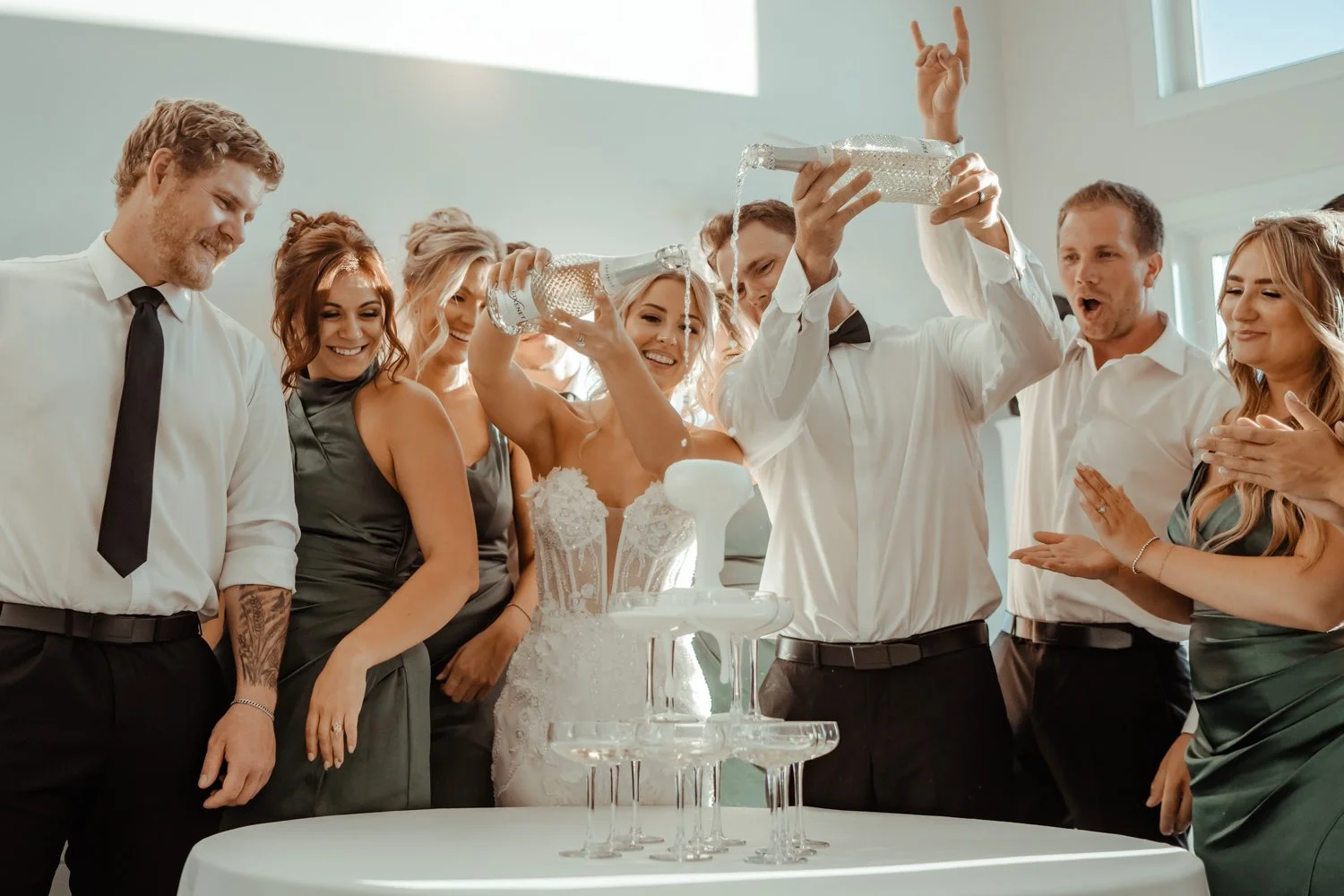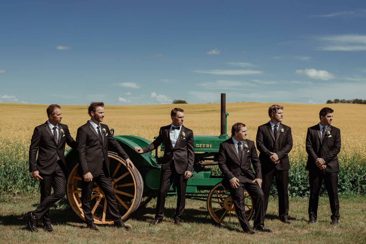 Chelsey was radiant in a Maggie Sottero gown from Bridal Debut, complemented by the incredible work of her beauty team. Tee & Co. Salon and EB Mane Collective handled hair, while KM Beauty by Kendra, Brenna Skjonsberg, and Alayna Denae Schmidt ensured everyone felt their best. The groomsmen kept things classic in suits from Tip Top Tailor.