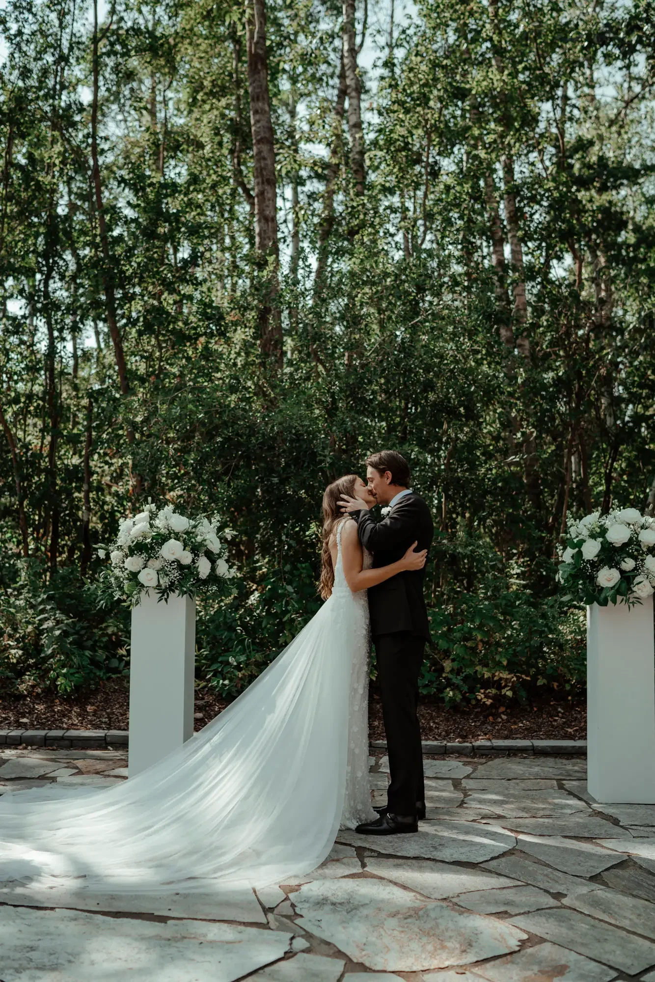 Entering the courtyard at Sparrow Lane—a space often described as an "enchanted forest"—you’re immediately struck by a sense of whimsy. Surrounded by towering trees and luxurious natural stone pavers, it is truly one of the most beautiful spaces to say "I do" in Alberta.