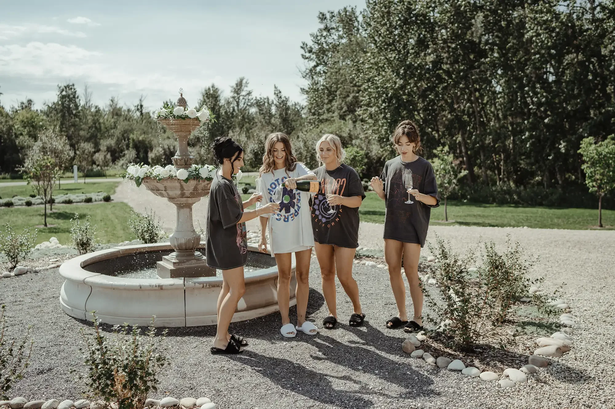 The morning set the tone for that intentionality. Jessy and his groomsmen spent their prep time at home with the couple’s dog, Hershey, while Karly and her bridesmaids opted for vintage graphic tees over traditional robes as they popped sparkling wine by the fountain. It was a refreshing departure from the "standard" wedding script.