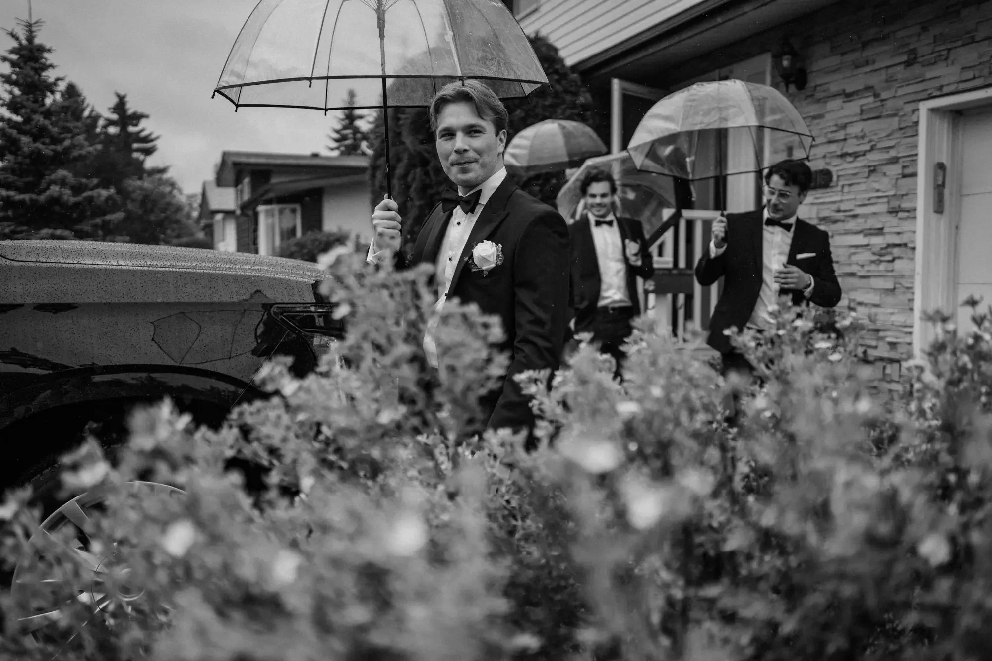 When it came time for the ceremony, everyone tucked under umbrellas for the short walk to the cars. Those clear umbrellas you see in the photos are a staple in our kit; we always keep a full set in the back of our vehicle so you and your wedding party stay dry. We prefer the clear style because they allow beautiful, soft light to hit your face—which looks spectacular under cloudy, overcast skies.